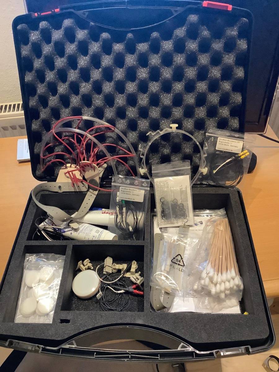 Biofeedback-Anlage mit Hard- und Software Jedoch ohne Notebook Atem, Blutvolumen-Puls, Temperatur, Hautleitwert, 4 muskuläre Ableitungen, 2 EEG-Ableitungen. Viele Sensoren sind doppelt vorhanden, auch einige Klebe-Elektroden für EMG sowie eine Dose 10/20-Paste für EEG-Elektroden.